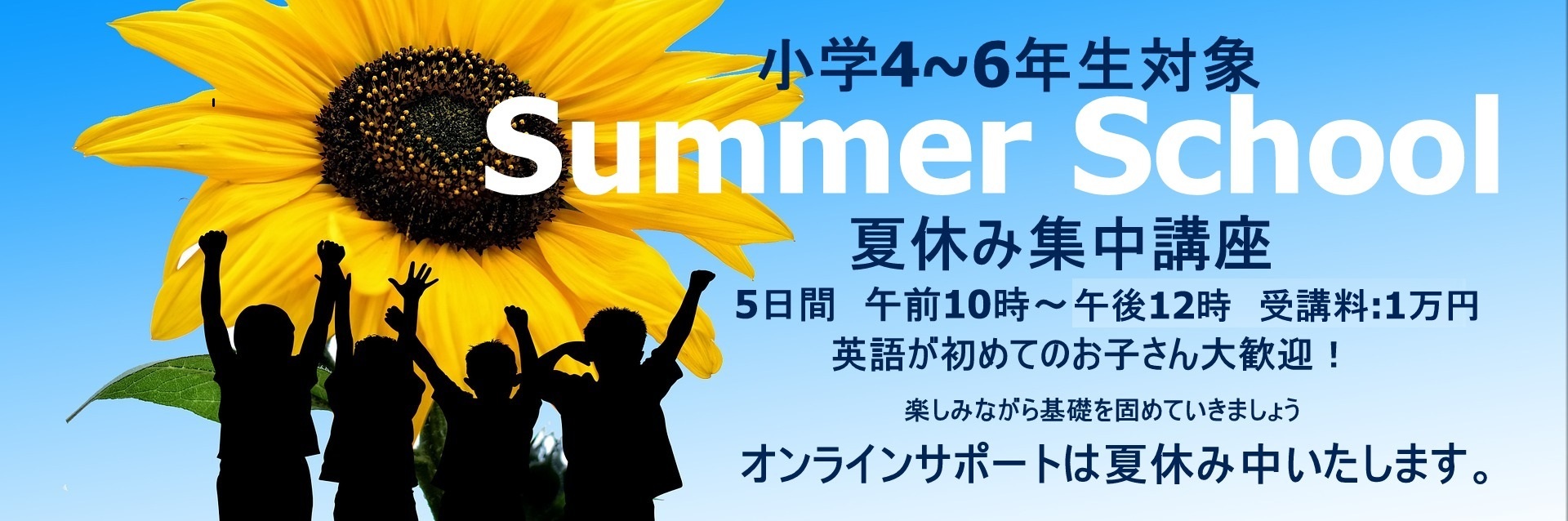 英語の基礎の基礎は「音」。音がしっかり身に付き、それを「読み・書き」に繋げていくことができれば、自力で英語が学習していく基盤ができます。その基盤作りは10歳前後が最適です。中学で英語嫌いになる子供達が多い事を本当に残念に思うと同時に、1人でも多くの子供達が英語の楽しさを経験してほしいという願いを込めて、夏季集中講座を企画しています。英語初めてのお子さん大歓迎ですので、ぜひこの夏、英語の基礎を楽しく固めていきませんか?