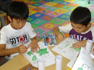 第2部のクラフトタイムでは、自分の写真入りのオリジナルバックを制作。私はアイロン転写に必死になっていたため、写真をとることができませんでした・・・すみません。 また、5日目の須磨海浜水族館への遠足に持っていく小冊子も制作中。楽しいアクティビティーがたくさん詰まったDay2の写真もアップしますので、ぜひチェックしてくださいね!