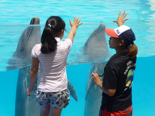 イルカショーはステージの近くで。イルカの水しぶきを浴びるのをワクワクしながら待っていました。