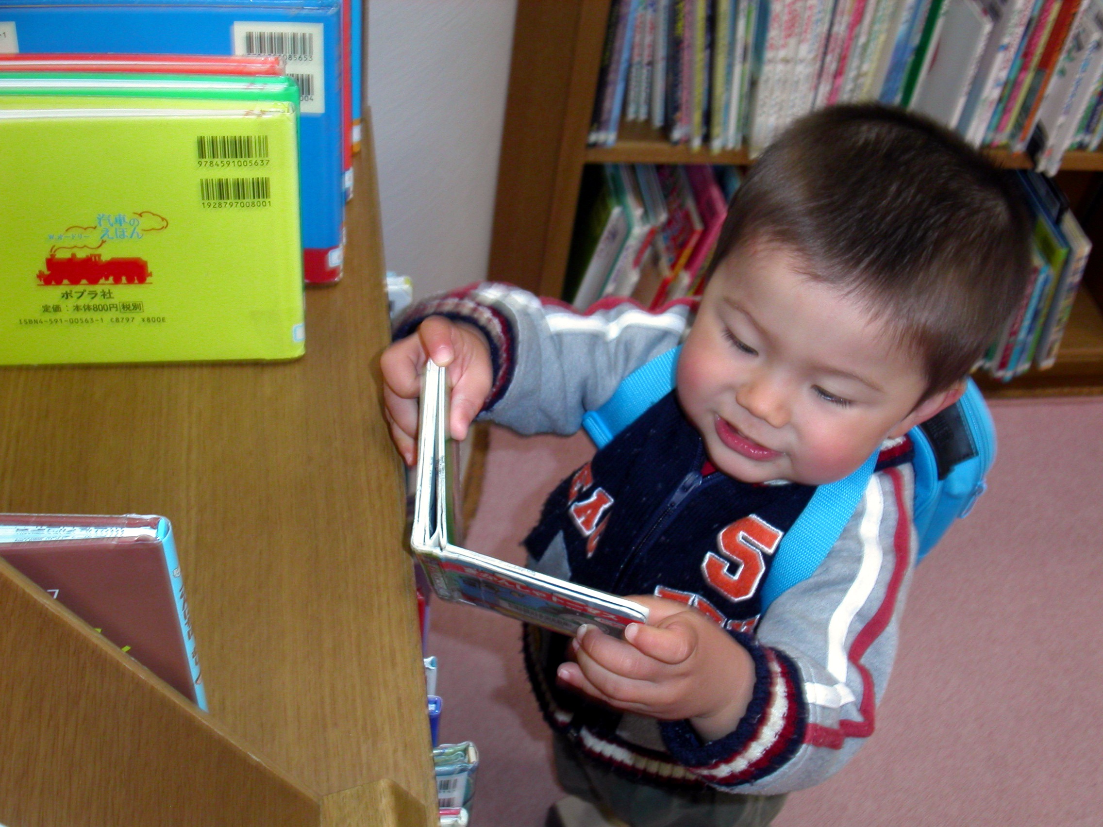 There’s a library at the community center near our house just across from the Century Bridge. Ken loves the library because it has Thomas the Tank Engine books. He doesn’t care yet if it’s 英語 or 日本語, he just likes the pictures. His favorite train is Gordon. He used to say “GO-JUU!” but these past few days, he can actually pronounce “Gordon.” He also likes James, but he pronounces his name “PU-JUU!” When Ken sees the Hankyu train he thinks it’s James.
