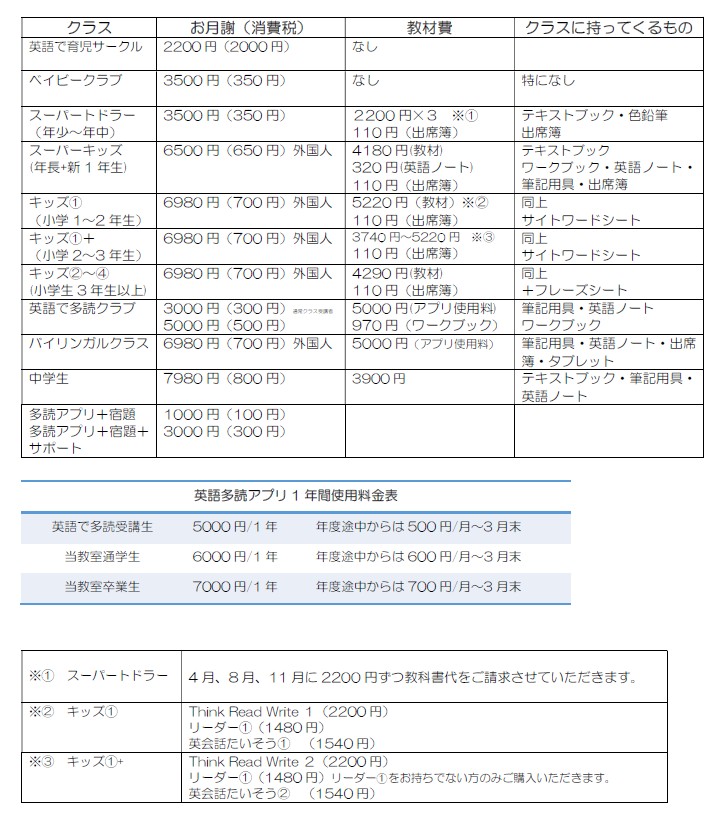 料金について 2025年度 料金一覧表 幼稚園(小人数制クラス)・小学生クラス・中学生クラス・バイリンガルクラスは振替制度(補講)があります。 入会金:5500円(1家族につき) 年会費:5500円 (1家族につき) 受講回数:基本的に週1回、年に44回 週2回クラス受講の場合、2クラス目より受講料半額 家族割引:1つの家族から2名以上の生徒が入学する場合は、2人目から一ヶ月ごとに500円の割引が適用されます。 尚、入学金・年会費は一人分しかいただきません。 料金表