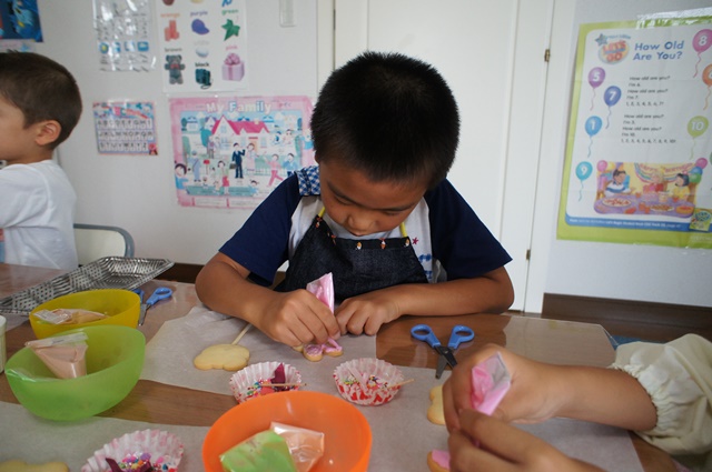 そしてクラフトタイムでは、アークアカデミー恒例(?)のアイシングクッキーを制作しました。今回のアイシングクッキーは棒がついたクッキーポップス。