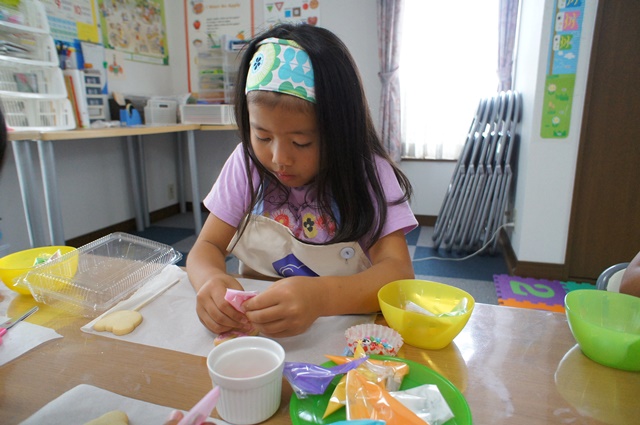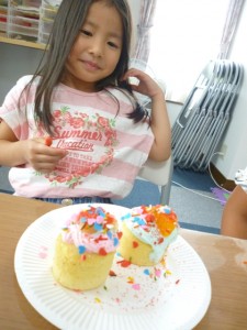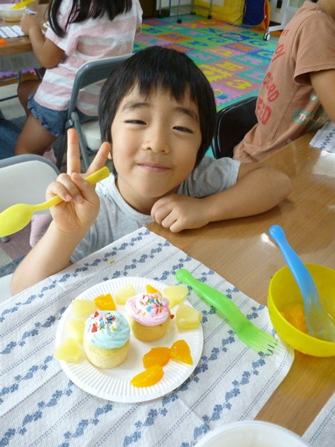 スナックタイムでは、ミニカップケーキに自分で可愛くデコレーションしたオリジナルケーキを食べました。